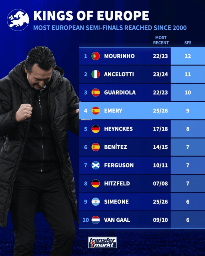 虎扑04月17日讯欧联杯1/4决赛,维拉两回合双杀博洛尼亚闯进半决赛。德转统计,在本世纪,埃梅里共9次闯进欧战半决赛,仅次于穆里尼奥、安切洛蒂以及瓜迪奥拉3位名帅。