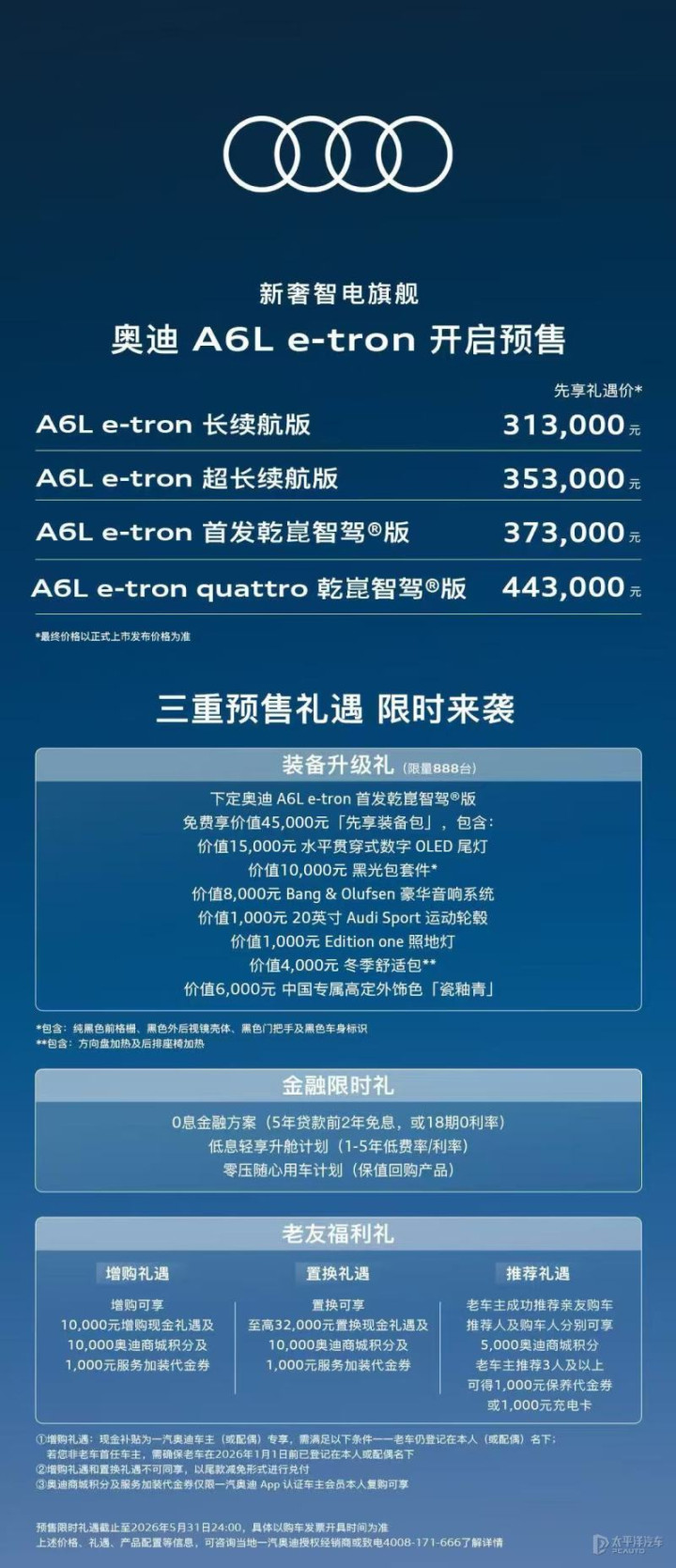 作为了解,奥迪A6L e-tron已在3月25日开启预售,共推出4款车型,预售价区间为31.30-44.30万元。新车定位中大型纯电轿车,基于全新PPE纯电动车平台打造(800V电气架构),配备107度电池,CLTC工况续航里程815km,充电10分钟续航增加302km。此外,新车搭载华为乾崑辅助驾驶系统,配有2颗激光雷达,支持高速/城区领航辅助驾驶。